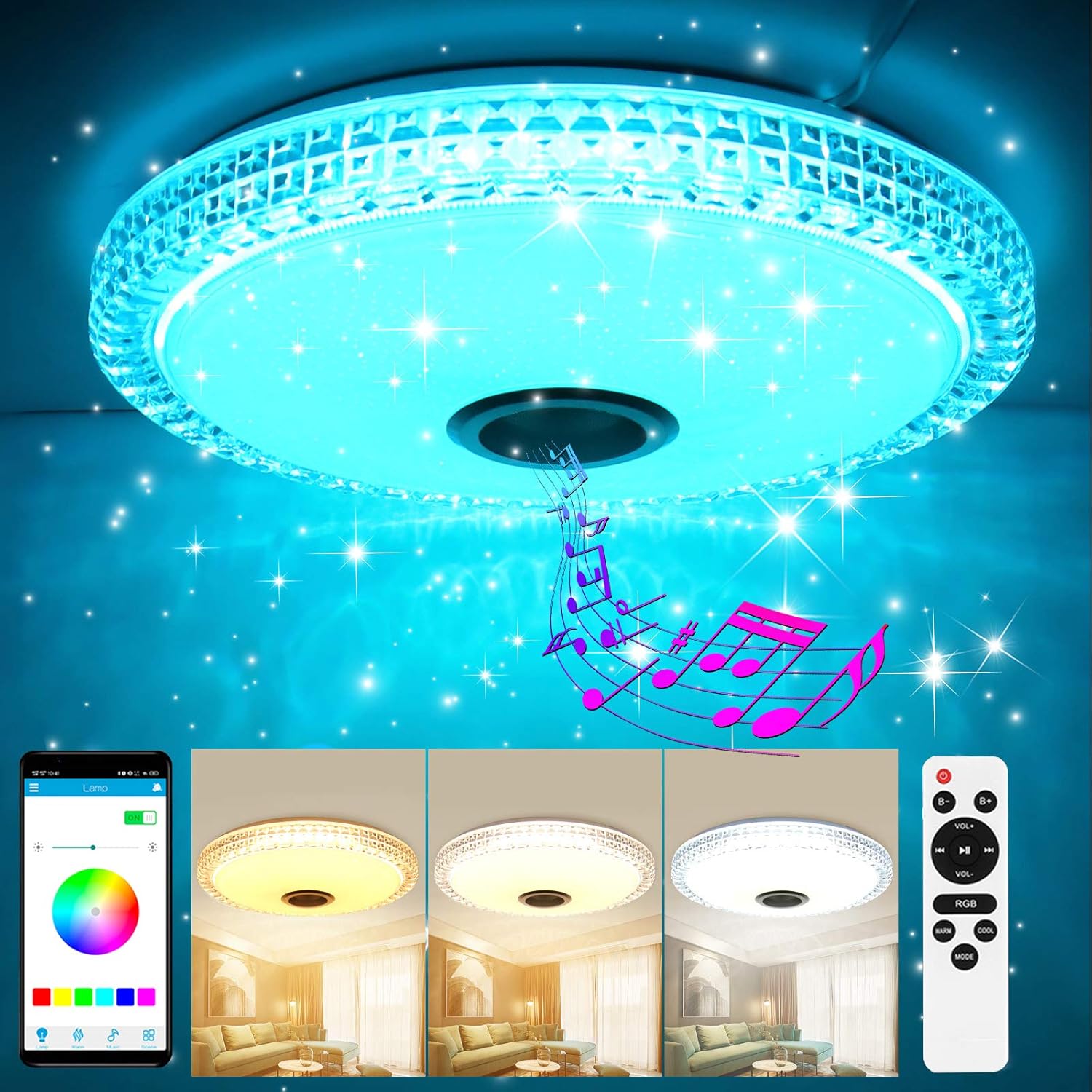 24w Led Deckenleuchte Farbwechsel Mit Fernbedienung Musik Deckenlampe Mit Bluetooth Lautsprecher O38cm 2700 6500k 1800lm Rgb Licht Dimmbar Fur Kinderzimmer Innenbeleuchtung Quizapp Beleuchtung